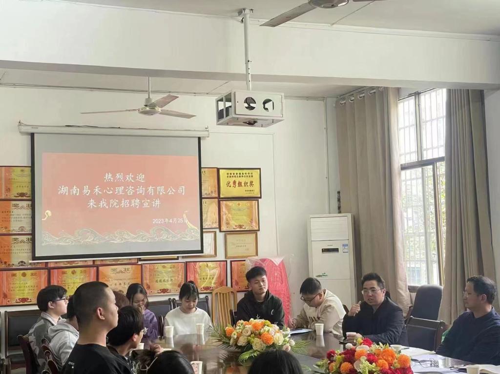 4月25日下午,2023年湖南易禾心理咨询有限公司招聘宣讲会于甘澍楼304举行。湖南易禾心理咨询有限公司董事长易胜其,顶岗实习生杨国艳,教育学院应用心理学教研室主任王旭红,就业专干梁鑫,部分19级应用心理学专业学生参会。