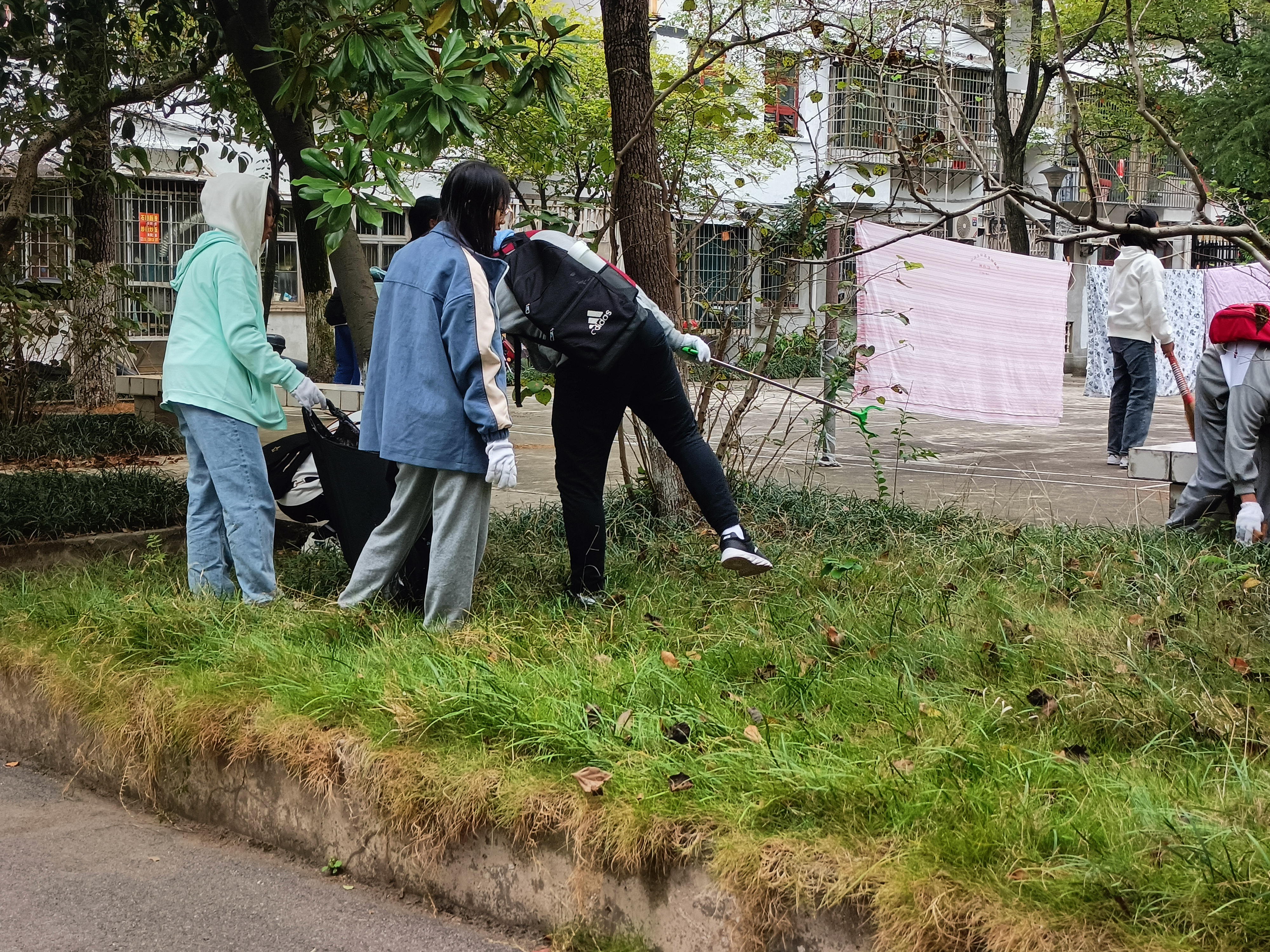 同学们被分好组后,拿着劳动工具,有序地来到划分的位置开始打扫。落叶静静地躺在石板路和草地上,等待着来人将它拂去。枯黄的树枝东倒西歪地落在地上,深绿色的藤蔓或缠绕在树上或在空中飞舞。同学们分散在落叶堆积、杂藤攀缘之处卖力打扫着,下着的蒙蒙小雨并没有阻挡同学们的步伐,他们继续以饱满的精神状态清扫着,没有丝毫抱怨之声。最终,在同学们的齐心协力下,打扫完之后的花田又展现出了勃勃生机,一片绿意映入眼帘。同学们虽然辛苦,却收获到了快乐、收获到了团结与友爱的精神,更加巩固了自己的集体意识和劳动光荣意识。在督察部干事的检查拍照后,各班有序放回劳动工具并解散。第一次“守望花田”活动圆满结束。