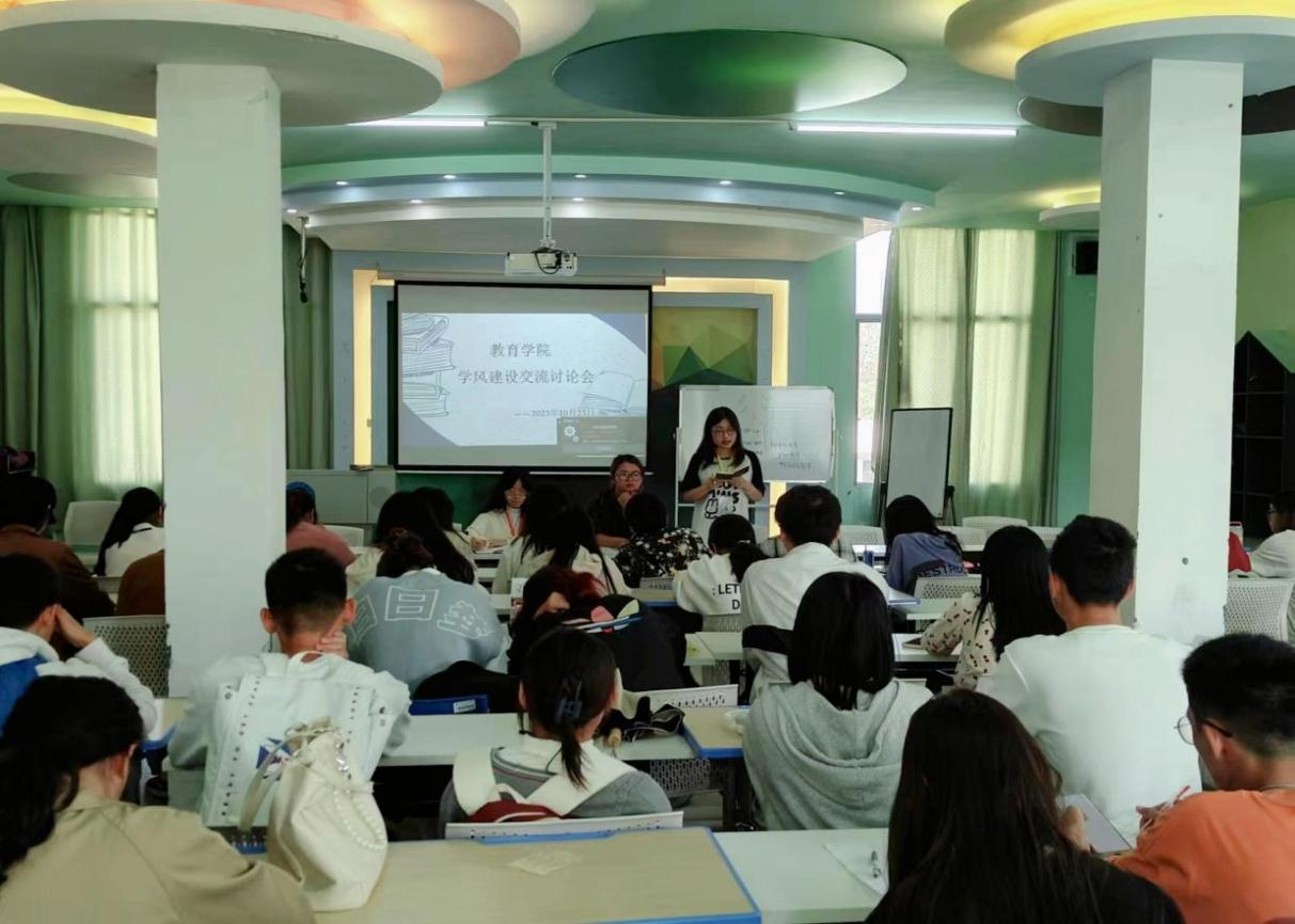 为加强学院学风建设,教育学院于10月23日中午在甘澍楼601教室开展学风建设交流会。辅导员文思婕老师、团总支学生会主席熊佳柔、学习部部长苏悦、21-23级各班班长和学习委员参加了此次会议。