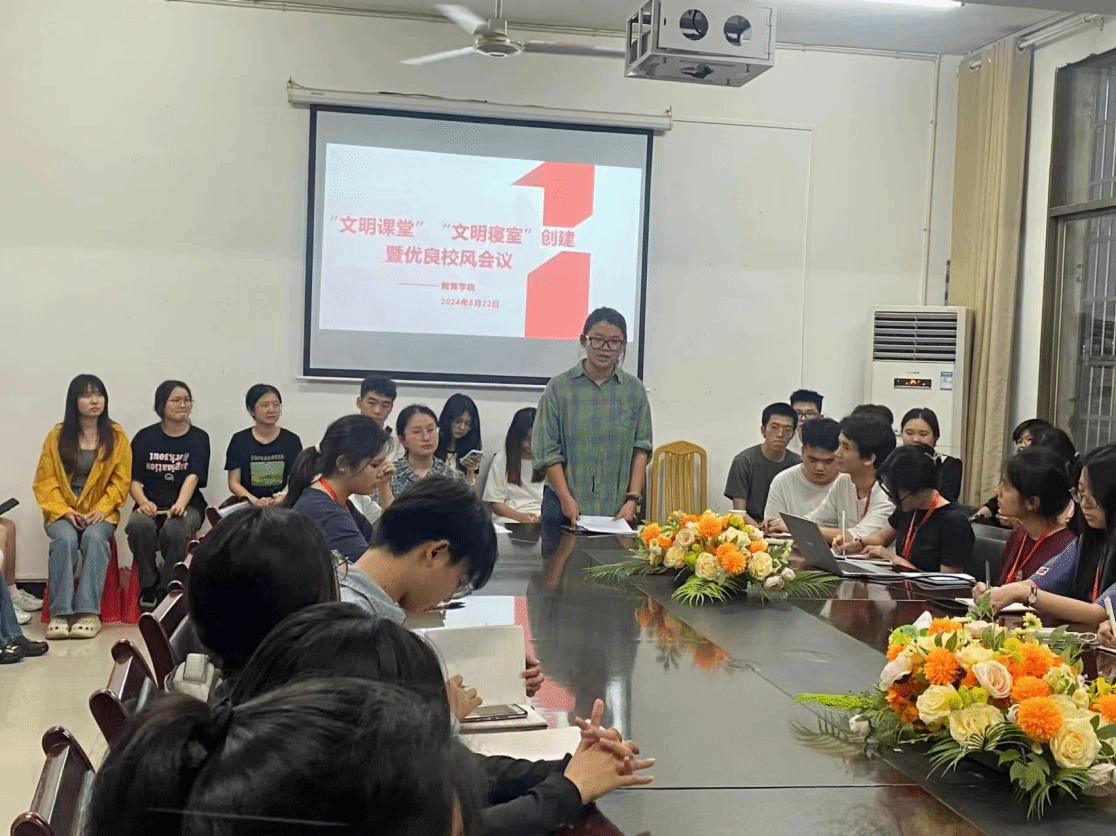 文思婕传达了学校文件精神,对学院各班级的课堂纪律以及寝室文明建设提出了相关要求。她要求同学们在课堂上需专注听讲,靠前就座,积极参与课堂,并提醒大家要按时上课,不早退、不旷课。希望同学们注重仪容仪表,以整洁大方的形象展现学生风采。此外,寝室文明建设方面,要求同学们保持寝室的整洁,并明确指出,寝室内严厉禁止使用违规电器。