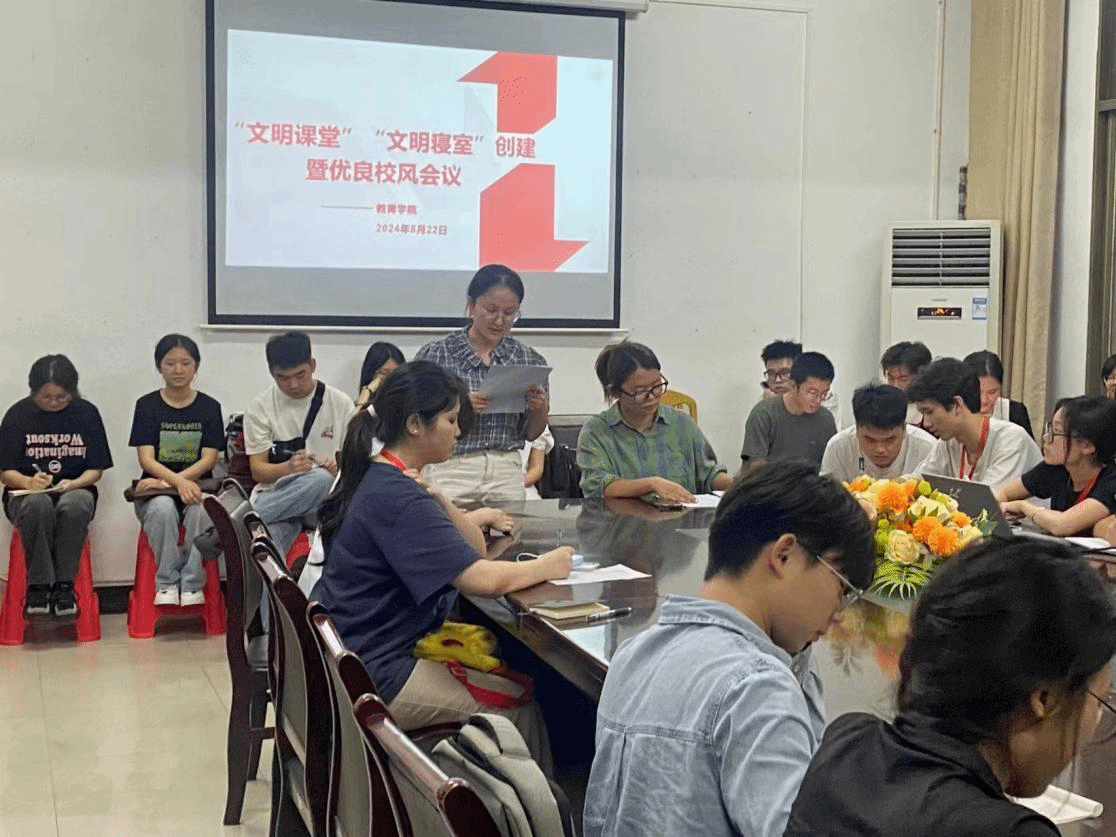 5月22日晚,教育学院在甘澍楼304开展了“文明课堂”“文明寝室”创建暨优良校风养成会议。辅导员文思婕、肖阳以及21级、22级、23级各班班长、学习委员及团学会部分学生干部参加了本次会议。