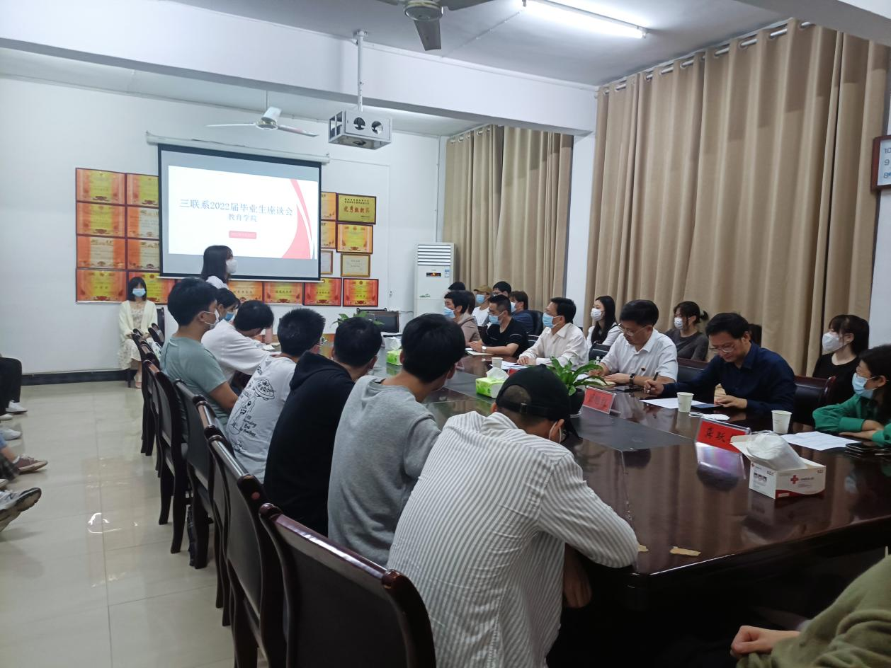 4月27日晚上,学校党委委员、副校长陈志国与学工处、继续教育学院等部门领导在教育学院开展“三联系”2022届毕业生座谈会,指导毕业生就业创业工作,了解学生学习、生活、工作上困难,帮助学生解决急难愁盼问题。学院全体领导、教研室主任、毕业班班主任、辅导员和2018级在校全体毕业生150余人,按“应心、学前(学合)、人教”专业分为三个会场座谈交流,党总支书记邹坤、副书记田密、副院长曹俊军分别主持,学校优秀校友、易禾公司董事长易胜其应邀参加。