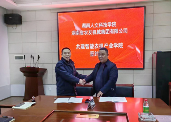 为深化学校和湖南省双峰县人民政府及其相关农业机械企业之间的校地校企合作,提高应用型人才培养质量,12月15日上午,能源与机电工程学院院长胡东代表学校和湖南省农友机械集团有限公司董事长刘若桥签订共建智能农机产业学院合作协议,科研处副处长陈瑶等人出席签约仪式。