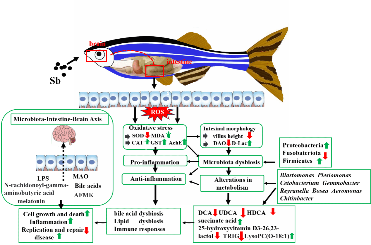 这项工作通过急性和不同环境剂量锑暴露的亚慢性实验,从不同环境剂量锑对斑马鱼的肠道毒性效应、 鱼体内 Sb 富集规律、组织形态学变化、 氧化应激和肠道微生态变化五大方面评价探究锑暴露对水生生物的肠道毒性效应与肠道微生态的影响。研究发现,成年斑马鱼肠道代谢物在暴露浓度仅为 30 µg/L 时已受到严重干扰,表明锑暴露显著影响代谢稳态,相关锑标准的制定应该基于肠道代谢变化方面去重新调整水生生物慢性锑暴露限值。去氧胆酸,胆固醇及其衍生物,磷脂酰乙醇胺等肠道代谢物含量的显著变化,进一步说明环境剂量锑暴露会引起肠道细菌氧化应激,导致炎症发生。熊去氧胆酸,三甲胺等脂质代谢物含量变化与其特定肠道菌属呈现出相关性表明斑马鱼肠道微生物菌群对肠道微生态的维持起到重要作用。同时,LPS棕榈酰多巴胺褪黑素等与脑神经调节相关的代谢物含量变化与其特定肠道微生物菌属呈现相关性表明肠道微生物菌群参与微生物--脑轴调节。总之,环境剂量锑暴露对成年斑马鱼肠道毒性效应严重,可损坏肠道屏障,引发氧化应激,破坏肠道菌群动态平衡,导致肠道微生态失调,可能会通过微生物--脑轴的复杂相互作用产生,最终可能导致肠道疾病的发生并影响到成年斑马鱼的脑部健康研究为湖南省非饮用地水源的锑标准工作制定提供了全面的落理论支撑。