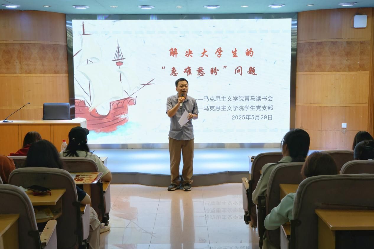 5月29日,马克思主义学院青马读书会和马克思主义学院学生党支部联合举办的解决大学生“急难愁盼”问题分享交流会在养根楼报告厅举行,活动由马克思主义学院学生王晓鸿主持,青马读书会负责人谢科峰博士及beat365部分学生参加。