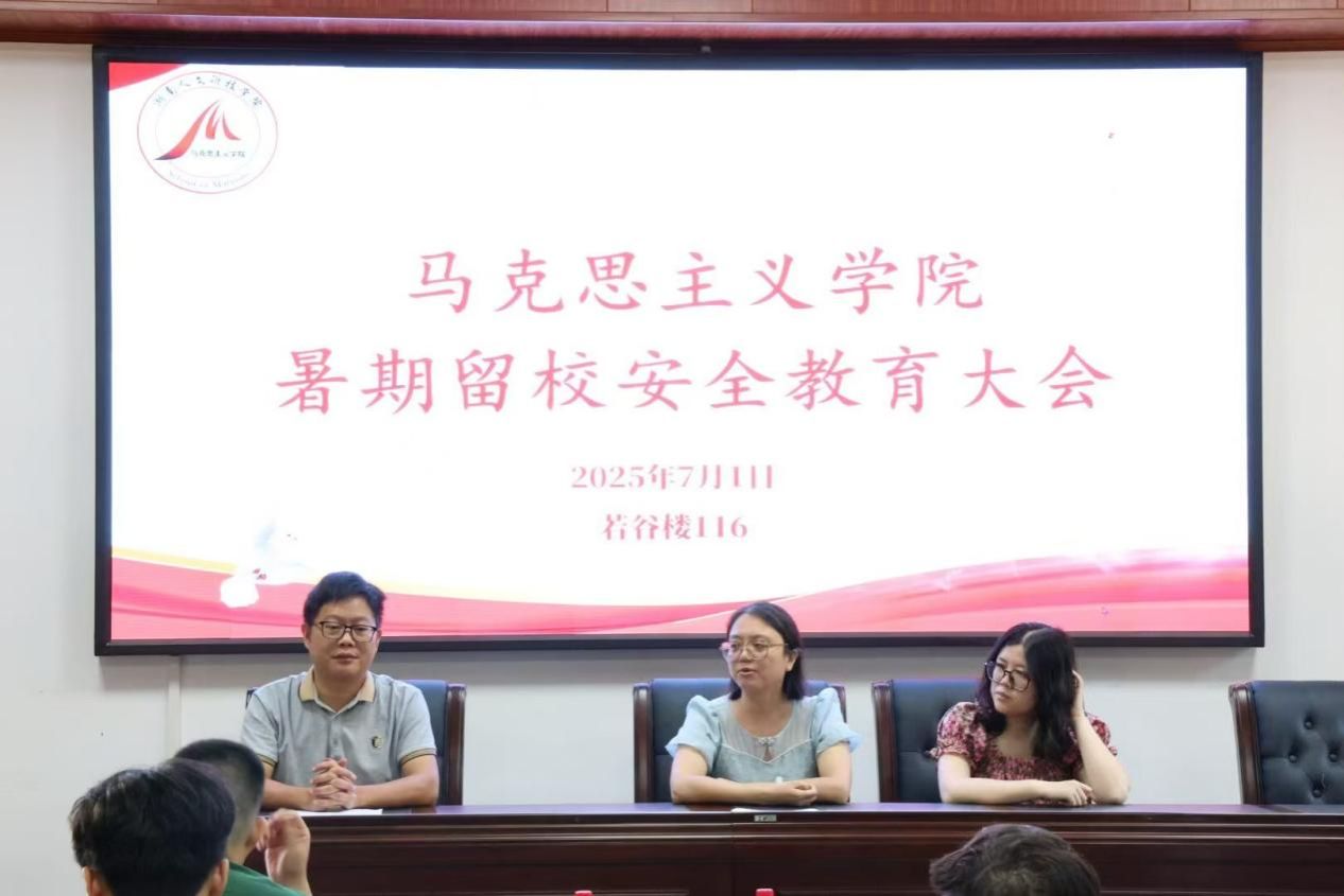 7月1日上午,马克思主义学院在若谷楼116召开学生暑期留校安全教育大会。党总支副书记阳青、学工办主任张得才、辅导员谢家玉,以及全体暑期留校学生参加会议。会议由张得才主持。