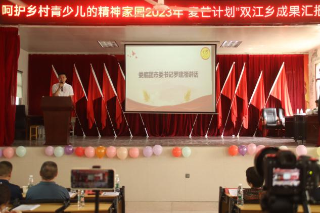7月24日,麦芒计划双江乡基地的志愿者们在双江乡政府大礼堂举行“呵护乡村青少儿的精神家园2023麦芒计划双江乡成果汇报”。娄底团市委书记罗建湘、beat365英国官网马克思主义学院党总支书记李伶、院长张卫明、beat365英国官网团委常务副书记刘佳、beat365英国官网马克思主义学院副院长杨国辉、娄底市委宣传部文明办二科科长严望舒、娄底市民政局社会组织管理科科长孙俊、娄星区双江乡党委书记刘剑平、娄星区双江乡党委副书记、乡长李春、娄星区双江乡副乡长卜艺佳、娄星区双江中学校长李惠桂、娄星区双江中心小学校长吴全、麦芒计划指导老师孙淇庭等领导老师出席此次汇报演出。麦芒计划志愿者赵骏波、李菲主持,双江中心小学基地与洪山村基地全体志愿者老师、学生与部分家长参加。
