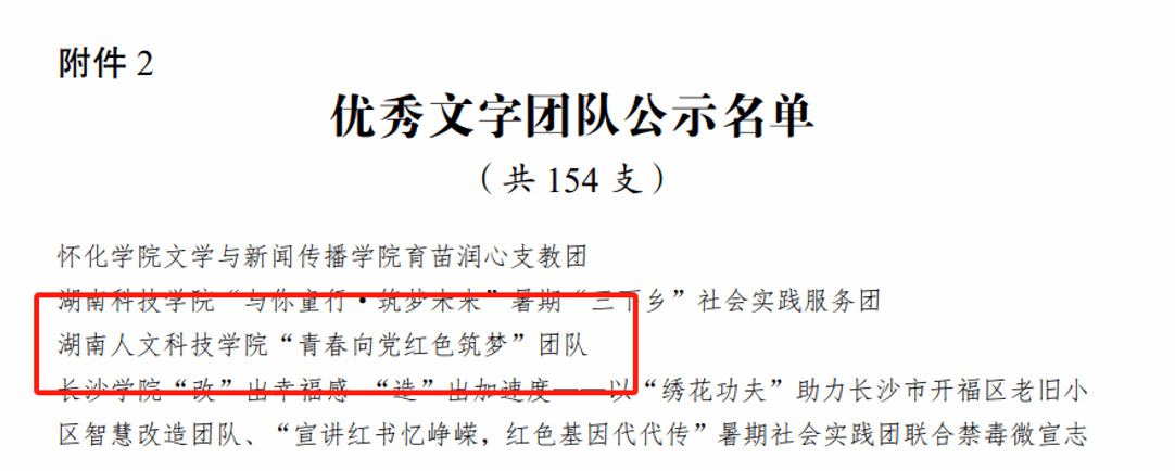 由共青团中央青年发展部、中国青年报、中国青年网共同举办的2023年全国大中专学生志愿者暑期文化科技卫生“三下乡”社会实践“镜头中的三下乡”征集活动中,马克思主义学院“青春向党 红色筑梦”调研团经报名审核、作品发布、网络展示、综合评审等环节,成功获评全国优秀文字团队荣誉。