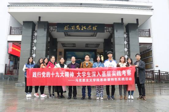 11月27—29日,我院开展了思政课特色实践活动“践行党的十九大精神,大学生深入基层实践考察”活动。我院师生和其他院学生代表一行15人在党总支书记游训龙教授、副院长杨国辉博士以及辅导员张得才老师的带领下,先后前往浏阳文家市镇、开慧镇、湘潭等地进行了考察学习。