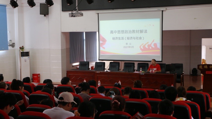 6月8日下午2:00,高中政治教材解读—--经济生活主题讲座在娄底六中举行,主讲人为郭众。参加本次讲座的有谢科峰老师、张得才老师和我院18级19级全体学生。在讲座中,主讲人通过讲解经济生活这一内容来讲述新旧高中教材的变化,其中新教材更加突显中国共产党的领导,同时结合这一变化向我院学子讲述教师资格证面试相关的技巧等。此外,他还提到古田会议是一场“思想建党,政治建军”的会议,并以此来勉励在场的学生坚定信念,筑牢使命担当。最后,讲座在一片掌声中圆满结束。