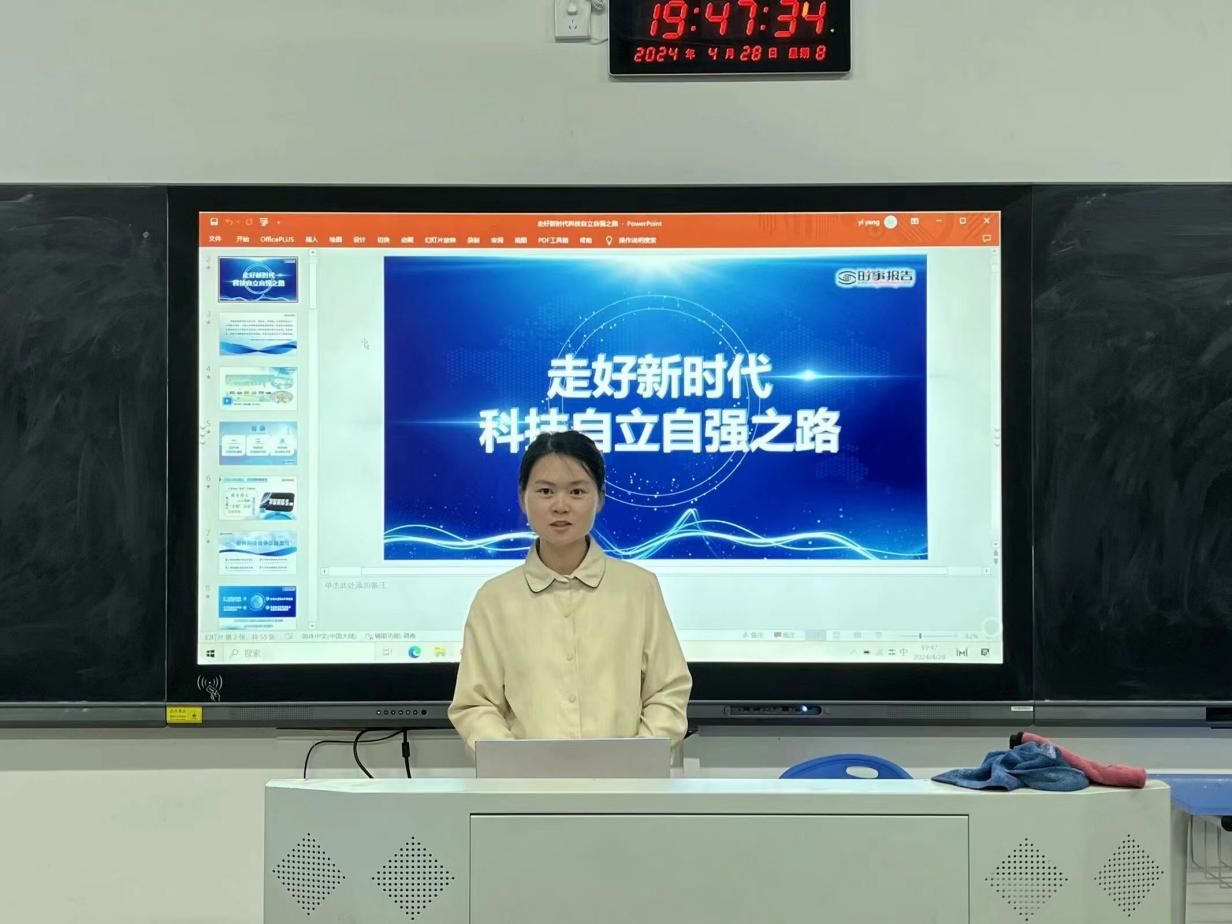 陈友庚老师讲述的专题是“当前国际形势与中国原则立场”,他紧密结合教学实践,从“动荡变革的世界”和“全球瞩目的热点”两个角度深入剖析当前国际格局,以“大国风范的外交”为主旨阐述了面对当前世界政治经济格局的变化与调整中国的主张与担当。杨玉华老师以“科技”为切入点,从“世界科技竞争日趋激烈”、“我国科技机遇挑战共存”和“加快科技自立自强步伐”三个角度阐述了“走好新时代科技自立自强之路”这一主题。
