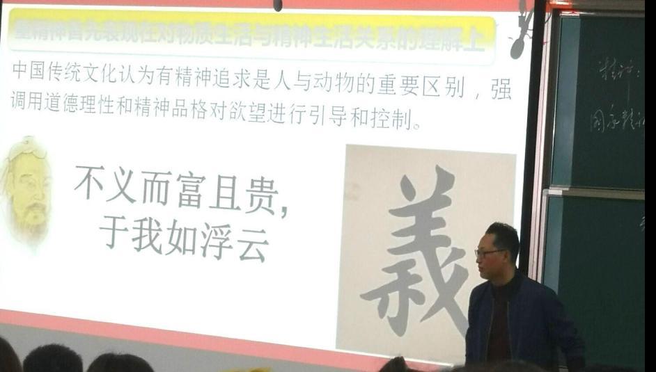 刘风雪博士以“弘扬中国精神”为主题进行授课展示,课堂上,他将中国哲学思想和传统文化因素巧妙融合,结合中国传统文化中的相关事例,展现了中国人民伟大的创造精神。同时,刘风雪博士强调要用道德理性和精神品格对欲望进行控制,引导同学们形成良好的品格,把优良的中国精神代代传承。刘老师的教学设计针对性强,突出学生主体地位,激发了同学们对如何在学习生活实践中传承、弘扬中国精神的思考。课堂氛围活跃,富有激情,同学们在老师的讲述和提问中进行讨论和思考,师生间互动积极,一堂精彩、高效的教学展示课圆满结束。