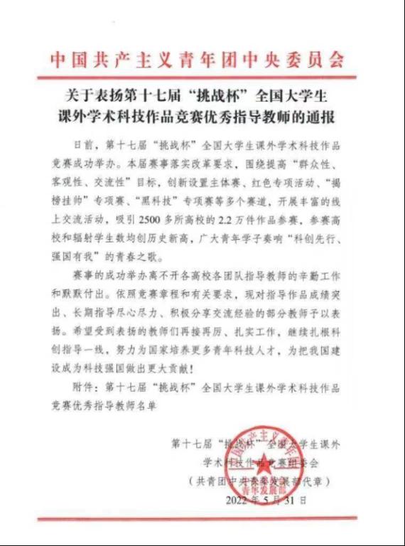 近日,共青团中央发布《关于表扬第十七届“挑战杯”全国大学生课外学术科技作品竞赛优秀指导教师的通报》,我校马克思主义学院副院长杨国辉教授被授予第十七届“挑战杯”全国大学生课外学术科技作品竞赛优秀指导教师荣誉称号,这是beat365教师首次在全国“挑战杯”赛事中获评该项荣誉。