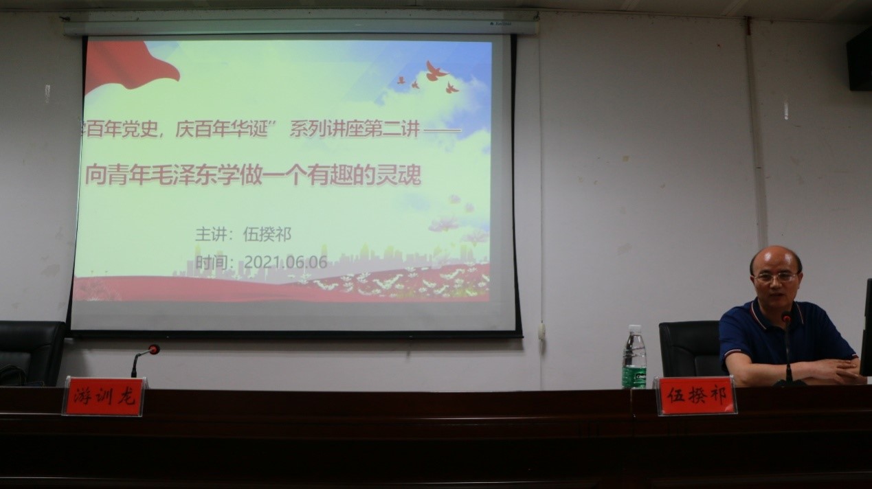 伍揆祁教授主讲《向青年毛泽东学做一个有趣的灵魂》。他以对当前社会热点话题“躺平”现象的评析作为导入,引导年轻人深入思考应当如何树立正确的人生观、价值观以及如何储备以奋斗姿态坚定前行的精神动能。伍教授指出,作为新时代的大学生,我们开展党史学习教育,尤应学习老一辈无产阶级革命家的理想追求情怀和坚韧奋斗精神。随后,伍教授图文并茂地向大家展示了青年毛泽东平凡而又非凡的学生时代的学习、生活、修养、储能、交友等多个截面,验证着青年毛泽东确是一个可爱、可近、可学的大美青年。伍教授从青年毛泽东好像一个“怪人”的新颖角度出发,截取他是一个独特奇趣的布衣书生、一个钟爱体育的好玩伙伴、一个乐读“无字之书”的穷游学子、一个笃好交友的纯净君子等多维视角,采取案例讲授法、对比分析法等方式,有力说明了青年毛泽东是一个心怀梦想、胸罗大才、热爱生活、充满情趣的小伙,结合新时代立德树人目标,引导当代大学生心有梦想,端正人生态度,积极向上向善,立大志、储大能、显大为、成大业,并劝导大家青春是用来奋斗的,而不是用来挥霍的。他寄望大学生们从青年毛泽东身上吸纳放歌青春、追逐梦想的壮气浩气和精神动能,接续毛泽东的青春梦、奋斗梦,奋力谱写为实现民族复兴而砥砺前行的人生华美篇章。