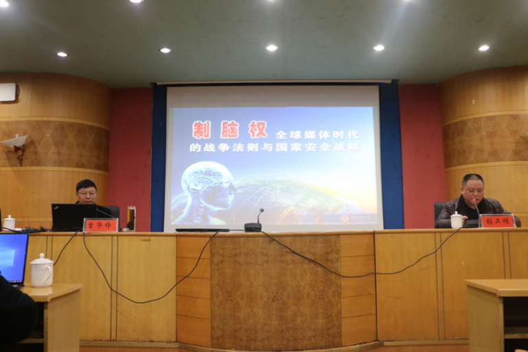 12月27日,国防科技大学博士生导师曾华峰教授应邀在养根楼多媒体报告厅作了一场题为“制脑权:全球媒体时代的战争法则与国家安全战略”的讲座。我院18级、19级学生和部分武保处教导大队队员聆听讲座。国防科技大学博士生周浩、省委党校张旺参加。讲座由我院院长、湘潭大学硕士生导师张卫明教授主持。