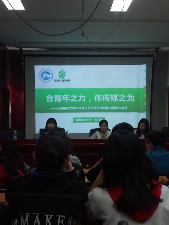 交流学习内容主要围绕"微信公众号与新媒体"内容展开,通过介绍"湖南师范大学团委"这一公众号的品牌形象设计过程、组织机构建立、系统运作、校园联动以及开展的部分特色活动,如校园记者节等优秀成功案例,分享建立新媒体的过程和收获,以及有效经验,借以帮助我们完善已有运作系统,锦上添花。同时,双方也在新媒体推送的选材与热点把握、宣传内容与形式创新等方面分享了自己的许多心得体验。