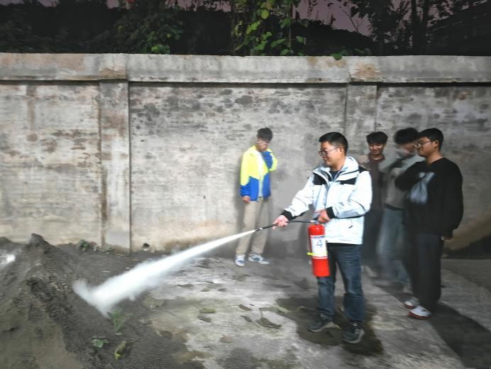 团课过程中,主持人带领同学们认真研读《学校消防安全管理指导手册》,进一步深化对校园消防安全规章制度的理解。随后,同学们集体观看《正确使用灭火器》教学视频,清晰掌握灭火器的规范使用步骤。主持人还结合《以青春之名 守平安之责》视频内容,通过现场提问、交流互动等方式,帮助同学们增强风险预判意识与应急反应能力。为强化实操技能,学工办主任张得才老师现场指导同学们进行灭火实践演练,锻炼大家在紧急情况下的应急处置能力。