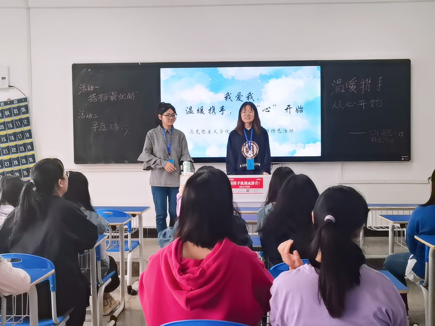 为帮助同学们建立一个乐观的心态,培养大学生健康的个性心理。5月22日,我院面向全体学生在致远楼603教室开展“我爱我,温暖携手,从“心”开始”心理健康主题活动。