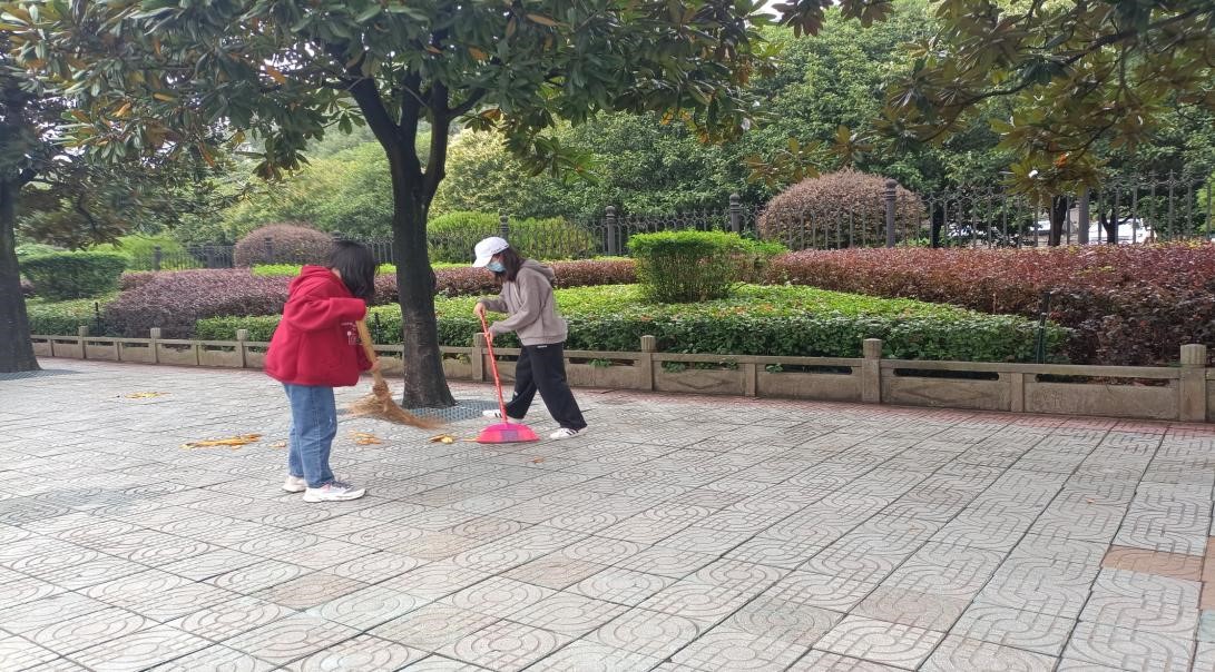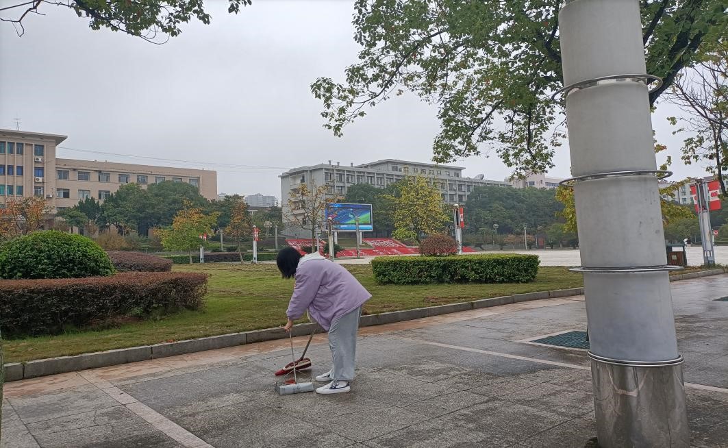 在进行简单的任务分配后,同学们开始对海园广场东侧的主校道进行彻底清理。受阴雨天气影响,清扫工作的开展尤为不易,枯枝落叶的清扫成为难题,绿化带的垃圾也变得湿重不易清理。合力清理“顽固”垃圾和卫生死角,对同学们来说是一场耐心与细心的考验。在清扫过程中,同学们表现出不怕脏、不喊累的积极心态,在完成好各自负责的清扫区域后,主动帮助其他同学打扫。在共同劳动的氛围中,凝聚成团结友爱的整体。