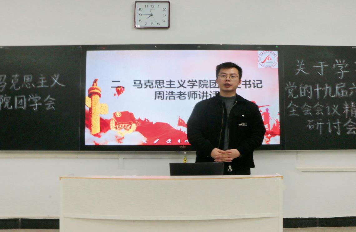 11月22日晚,我院团学会在致远楼604教室成功举办学习贯彻党的十九届六中全会精神研讨会。团总支书记周浩出席,团学会全体成员参加。会议由组织部志愿者干事周珂主持。
