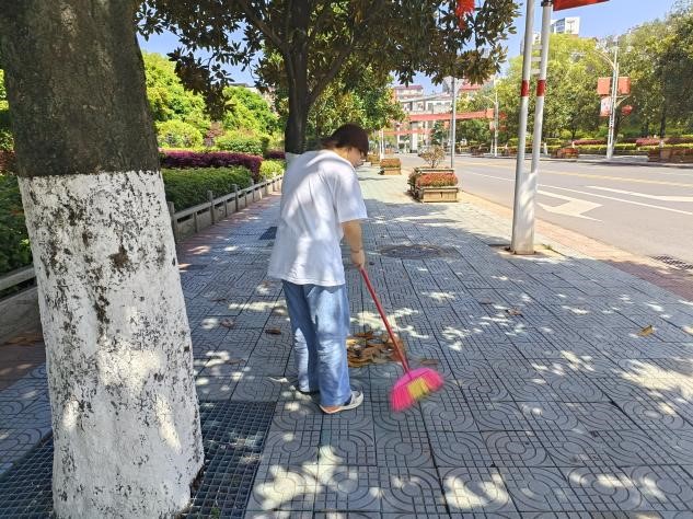 同学们在生活委员的指导下进行本次实践活动,有序领用劳动工具,分片区开展清理工作,严格遵守团队纪律,整个过程井然有序。天气炎热,同学们不但没有懈怠,反而更加积极热情,他们分工明确,互帮互助,一部分人负责捡着纸屑、烟头、塑料袋等杂物,一部分人负责扫落叶、倒垃圾,在合作中快速且高效地完成工作。