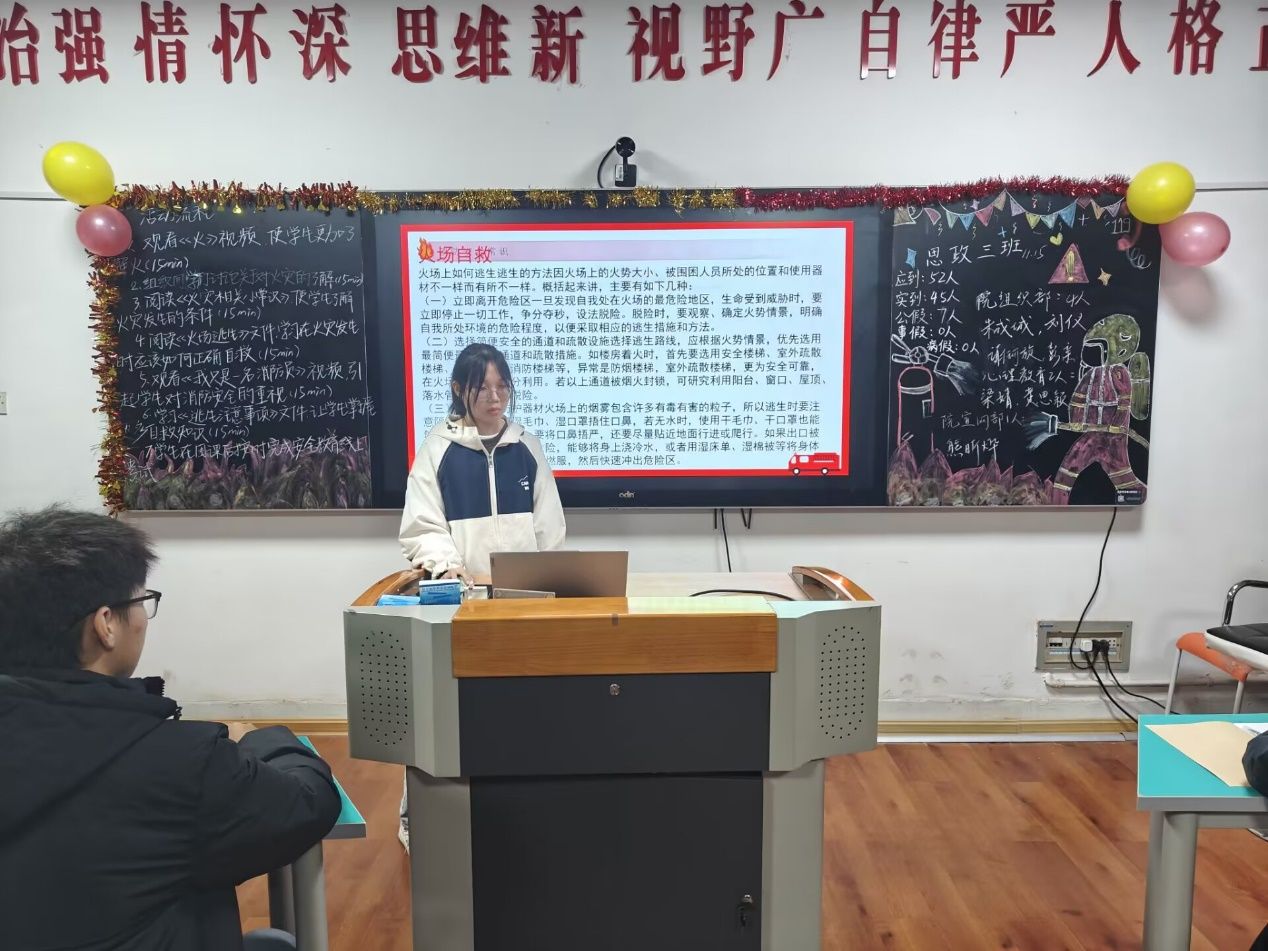11月15日晚,我院2023级全体学生于若谷楼分班开展“人人关注消防,共建美好校园”主题团课。