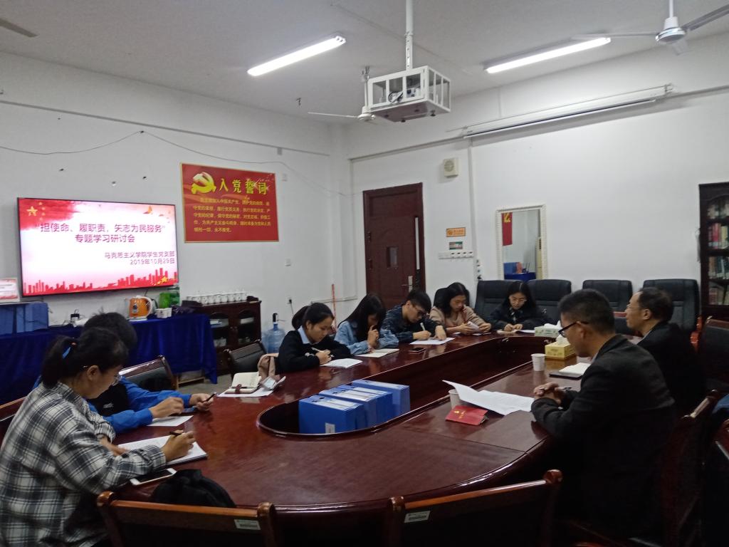 10月29日晚,马克思主义学院学生党支部在致远楼516举行“担使命,履职责,矢志为民服务”主题学习。院党总支书记游训龙教授出席指导,全体学生党员参加。主题学习会由学生党支部书记张得才主持。