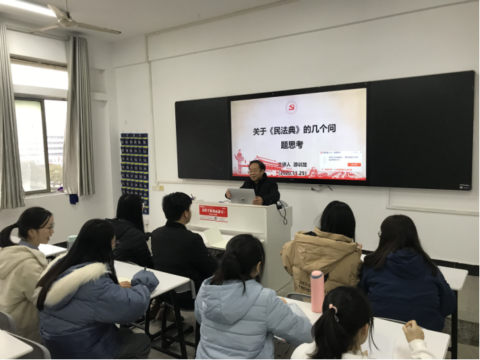 为培养学生党员法治思维,营造学习宣传《民法典》的良好氛围。11月25日下午2:30分,我院党总支书记游训龙教授在致远楼604教室给全体学生党员上了一堂题为“关于《民法典》的几个问题思考”的党课。