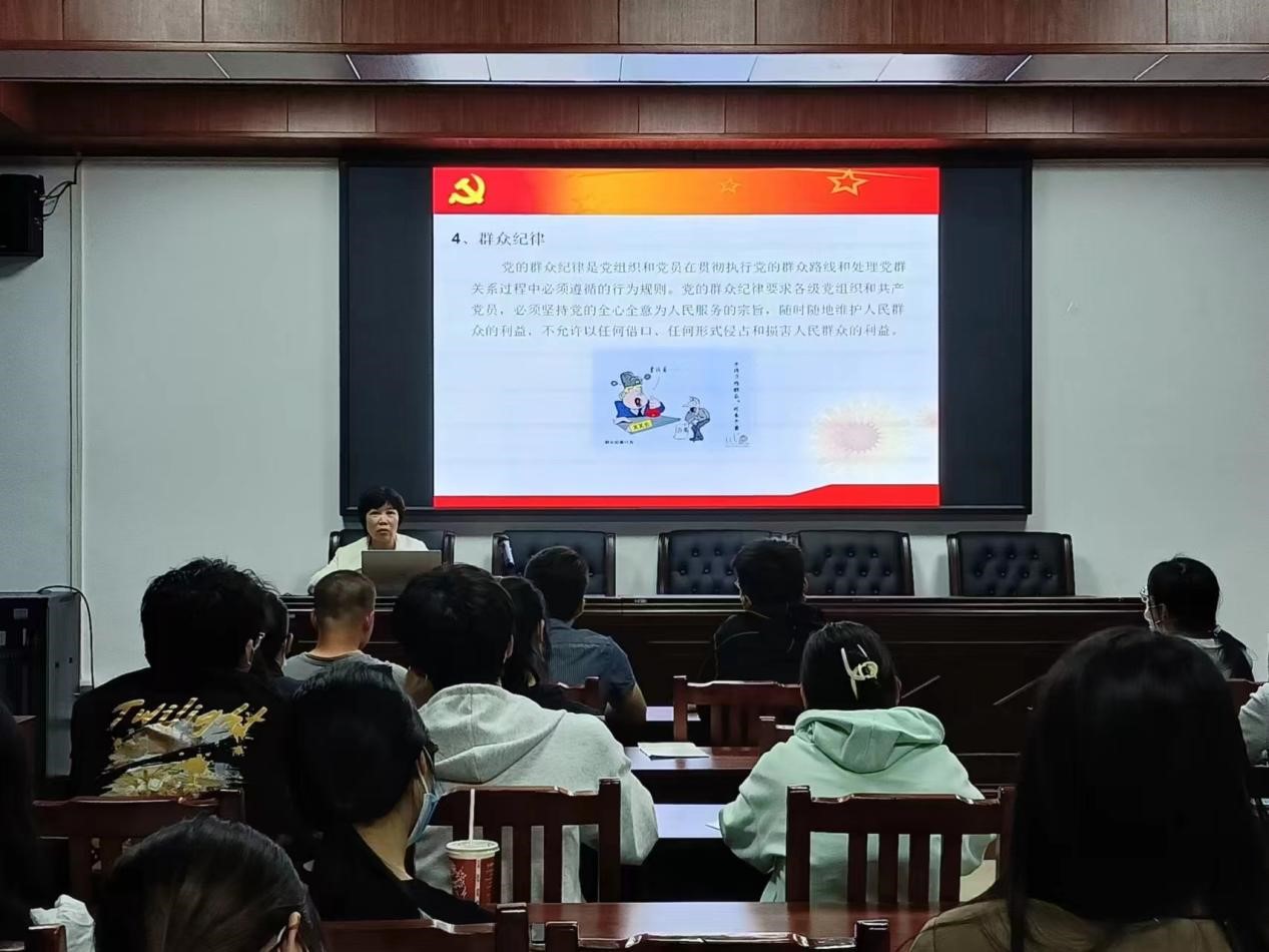 课上,李伶书记从党的二十大通过的《党章》修正案总纲部分、中国共产党的纪律性质和特征、党的纪律形式和党内纪律处分等四个方面系统地阐述了党纪党规的主要内容。她通过列举大量的事实案例,强调严格遵守中国共产党各项纪律的重要性,并勉励全体入党积极分子要有矢志不渝的政治信念、负重笃行的政治担当、勤勉务实的政治操守,“言”显政治态度、“行”表政治立场,廉洁自律,任何时候都要管得住行为、守得住清白。