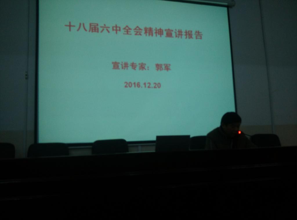 为学习贯彻党的十八届六中全会精神,12月20日下午,学校党委书记郭军同志为我院师生党员上专题党课。他讲的主要内容有:一、关于十八届六中全会的重大意义;二、关于全面加强和规范党内政治生活;三、关于全面落实党内监督责任;四、关于突出抓好领导干部特别是高级领导干部;五、关于抓好十八届六中全会精神的学习贯彻。郭书记的讲课,既讲述了十八届六中全会精神实质,又注重理论联系实际,使我院师生党员深受启发,受益匪浅。