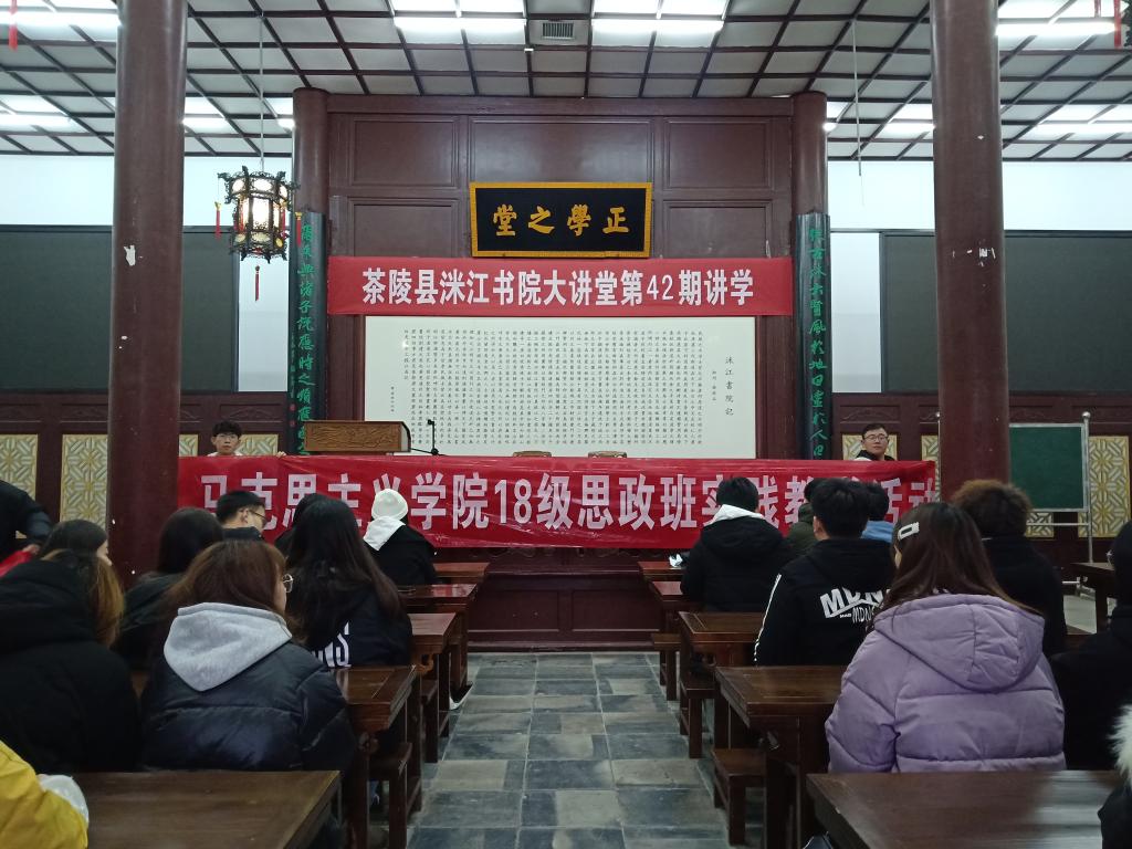 为深入学习贯彻习近平总书记关于加强“四史”教育的重要指示精神,传承红色基因,进一步深化思想政治理论课教学改革,拓宽实践教学渠道,在院领导的关心和支持下,12月14日-15日,我院18级开展了以“传承红色基因、感受书院文化,弘扬罗荣桓罗帅精神”为主题的思政课实践教学活动。18级全体学生在院党总支副书记成伟、班主任张得才老师的带领下赴株洲市茶陵县工农兵政府旧址、洣江书院,衡阳市衡东县罗荣桓元帅故居开展了实践教学活动。