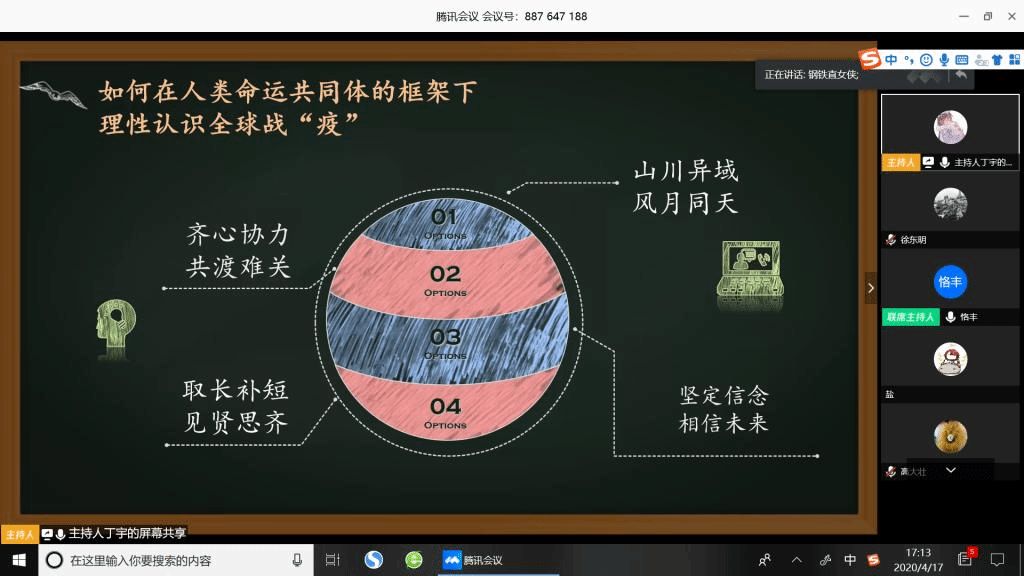 2020年4月17日下午,受上海大学历史系、上海大学文学院2018级历史系硕士研究生党支部邀请,我院谢科峰老师在线参加“共战疫情爱国力行”上海大学文学院历史系硕士研究生春季学期主题教育,并为上海大学2018级历史系硕士研究生作了一次“人类命运共同体框架下的全球防疫与人文关怀”主题讲座。