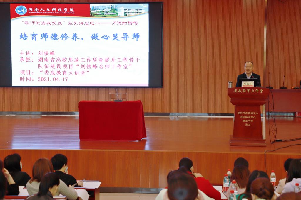 4月中下旬,学校党委委员、副校长,湖南省高校思想政治工作“刘铁峰名师工作室”主持人刘铁峰教授应娄底市教育局教师培训中心之邀,作客“娄底教育大讲堂”,为市直学校250余名教师做“教师的自我发展”系列讲座,为中小学教师的职业规划、能力提升、自我发展提供培训和指导。