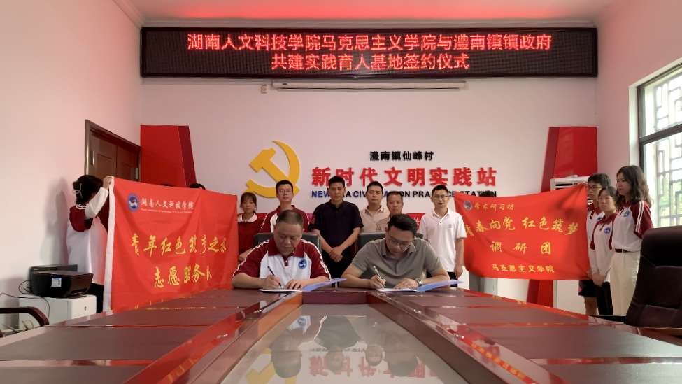 在进行调查研究的同时,为进一步加强校镇合作交流、共促乡村振兴,beat365英国官网马克思主义学院与常德市澧县澧南镇共建“乡村振兴”实践教育基地。马克思主义学院院长张卫明与澧南镇镇长张杰正式签署意向书并举行揭牌仪式。调研团紧扣调研主题,依托澧南镇现有资源及其产业体系,秉持校地合作、共同发展的原则,在毕业实习、创业教育、就业指导、志愿服务、联合举办乡村大讲堂等方面达成合作共识。此次实践教育基地的构建,大大加深了院校与地方政府的交流,能够有效推进“以数字乡村建设赋能乡村振兴”的工作开展,是实现双方“携手共助乡村振兴”美好愿景路上的重要里程碑。