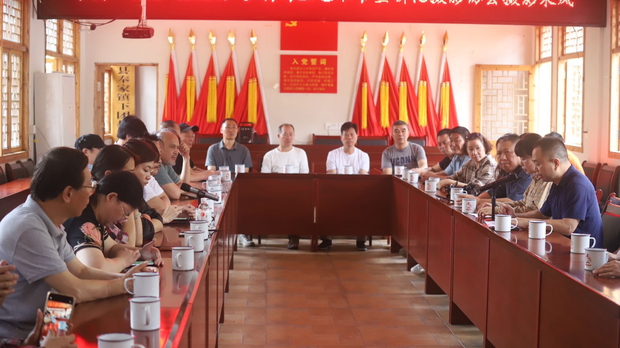 开幕式上,奉家镇人大主席李建章对艺术家们的到来表示欢迎,他表示,将结合奉家山得天独厚的自然资源和底蕴深厚的梅山文化资源,融入到美丽乡村和旅游发展中,以激发书画家的创作激情。陆序彦院长在开幕式上发言,首先对主办方的邀请表示感谢,同时发表“感言、感悟”。感言古桃花源艺术村浓厚的艺术氛围,感悟古桃花源艺术村独特的历史人文背景,并表示,今后将常带领师生前来进行写生创作。古桃花源艺术村落创始人范文茂表示,在已建古桃花源书画院、四十四号乡村公益书屋、乡村写生美术馆和古桃花源写生基地的基础上,为国内书画艺术家和爱好者搭建起更广阔的交流平台,运用艺术资源,书画形式,艺术视角,新媒体传播,记录和讴歌新时代下团村乡村新变化新面貌,形成"书画艺术+文旅融合+文化产业延伸"的布局,力求打造集书画艺术交流、山水风光观赏、民宿休闲养生为一体的村级文旅综合体,用艺术和美育为下团村乡村振兴赋能,使其成为下团村发展新动力。