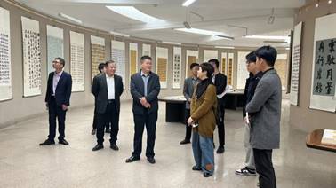 在第一站山东曲阜师范大学,贺平一行与书法学院党委书记、院长刘建新,副院长李建,专业教师陈鑫、竺传铠等进行了亲切座谈。座谈会上,双方就书法学一流本科专业建设、专业人才培养方案修订、常规教学特色及教学经验、招生就业等方面展开了深入交流。座谈会后,双方一同参观了该院主办的第11届“左手国学·右手书法”之“沐国学经典·承齐风鲁颂”主题书画展。