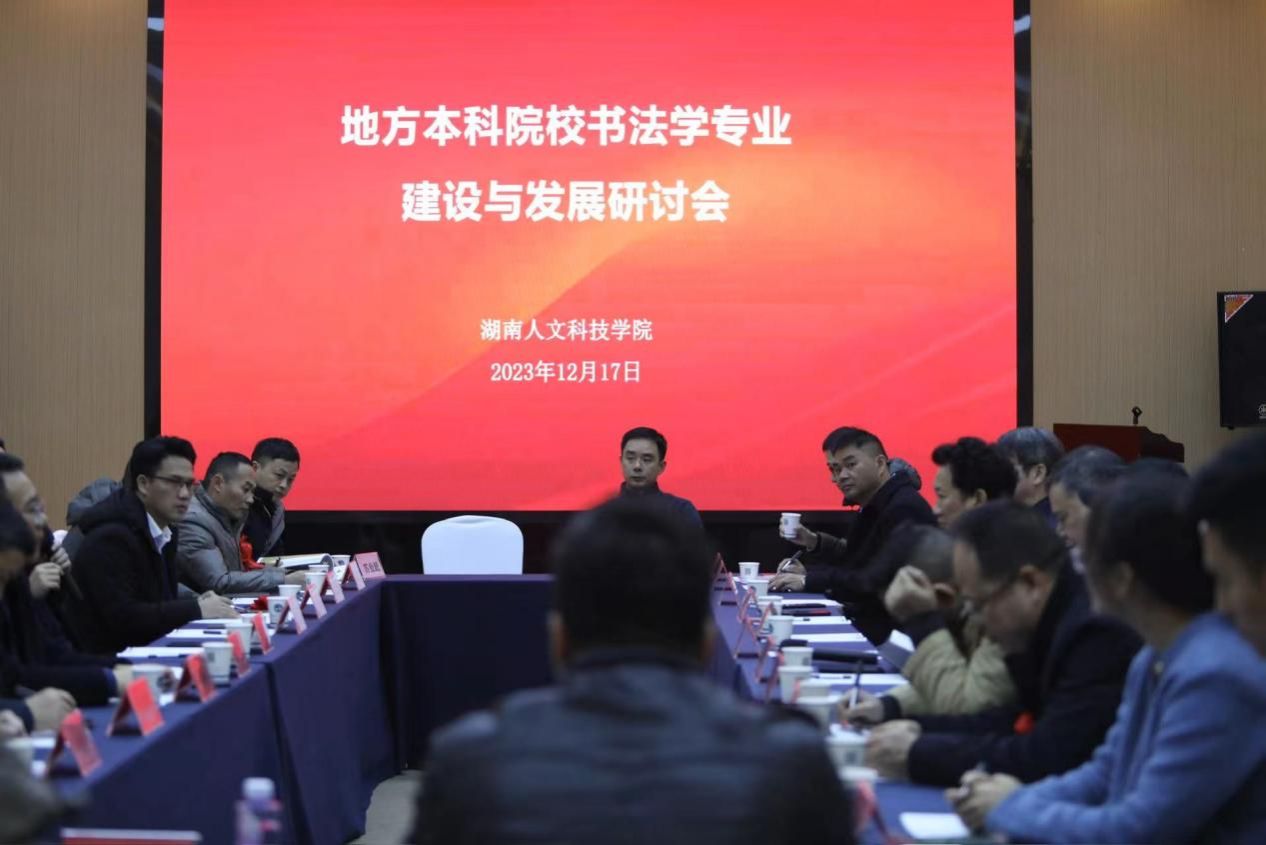 观展之后,学校在省展览馆召开了“地方本科院校书法学专业建设与发展”主题研讨会。研讨会由谢光绎主持。刘建勋简要介绍了学校的历史和现状,并对出席研讨会的嘉宾表示感谢。易俊恳请各位来宾一如既往地为学校书法学专业的发展提出宝贵的意见和建议。王希俊、崔向君、罗红胜、向彬、李正庚、江波、谢超、袁品良等湖南高校和书法界的嘉宾们从师资建设、课程设置、人才培养、就业创业等方面对地方本科院校书法学专业发展发表了各自的看法,为人文书法学专业发展问诊把脉、建言献策。
