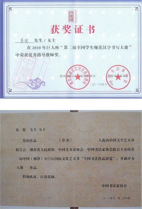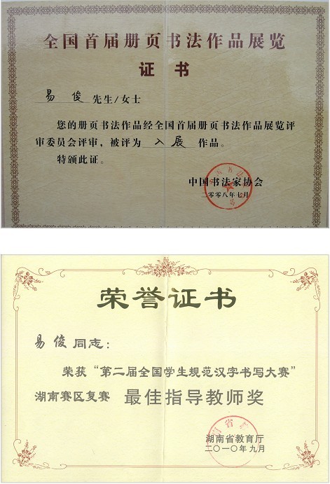 2010年在指导学生参加全国第二届规范汉字书写比赛中被湖南省教育厅评为“最佳指导教师”、被教育部、中国书法家协会评为“优秀指导教师”