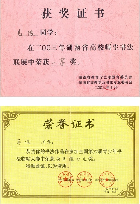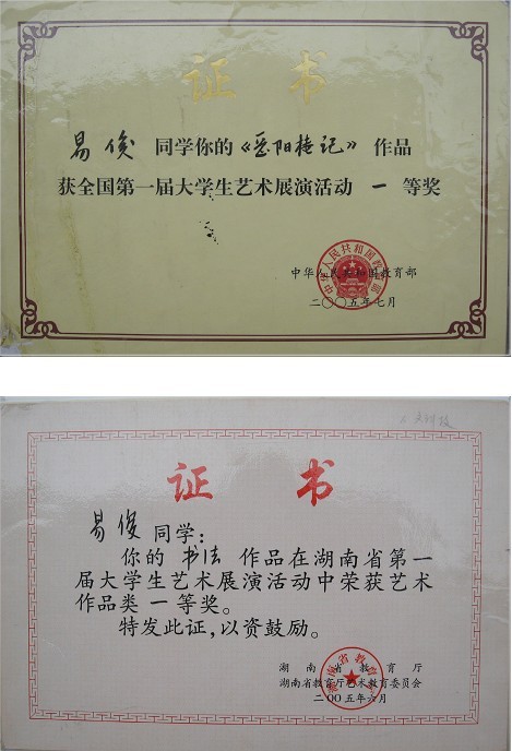 2005年获湖南省第一届大学生艺术展演活动书法专业组一等奖