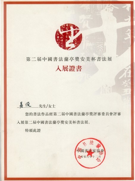 2006年入展全国第二届中国书法“兰亭奖”安美杯书法展,同年加入中国书法家协会(时年21岁)