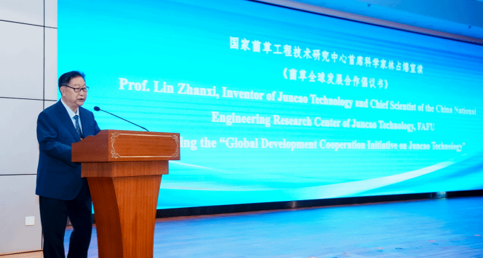 国家菌草工程技术研究中心首席科学家林占熺在开幕式上宣读