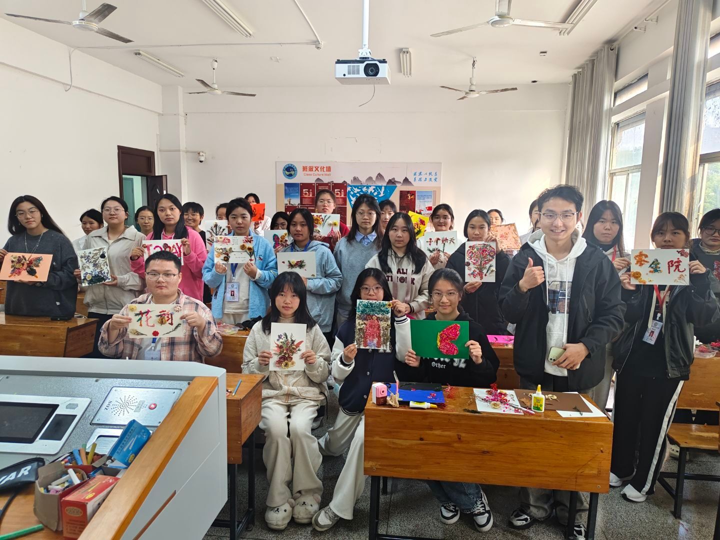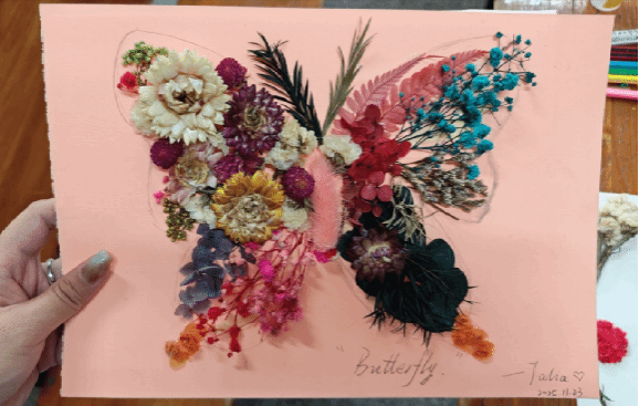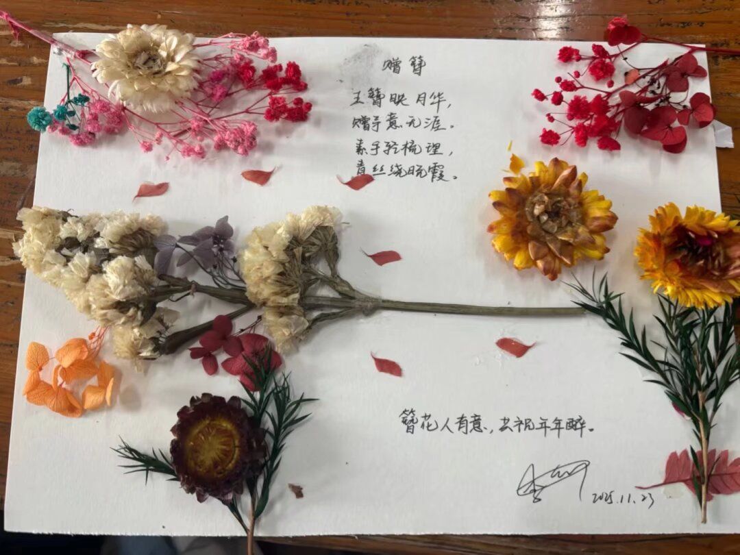 活动中,同学们以干花为材、以纸为卷,精心构思、细心粘贴,将一朵朵风干的花叶转化为富有生命力的艺术作品。在修剪、布局、黏贴的过程中,大家不仅锻炼了动手能力与审美素养,更在专注创作中体验到了耐心与细致的重要性。现场氛围温馨而投入,一幅幅独具匠心的干花画渐渐绽放于指尖,诠释了“化平凡为永恒”的创作理念。