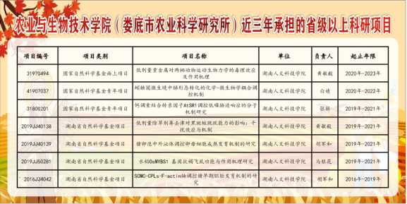师资力量 学院现有教职工87人,其中正高职称10人,博士41人,在读博士12人,硕士研究生导师32人。有省优秀中青年专家、省121人才工程人选、省青年骨干教师、省“青年教工党员示范岗”教师、教师课堂教学竞赛与教学创新大赛省级一等奖获得者等高水平人才。2012年来获省级以上项目68项,其中,国家自然科学基金项目9项,纵向进校经费2000余万元;发表论文360篇,其中SCI收录论文52篇;获国家级、省级、市级科技成果奖9项,其中,国家科技进步二等奖1项,省创新团队奖1项,省科技发明一等奖1项,省部级科技进步奖3项,市级科技进步奖4项;获湖南省农业丰收奖二等奖1项;获湖南省教学成果二等奖1项、三等奖2项;获国家发明专利26项;通过省级成果鉴定3项;选育农作物新品种(组合)9个。