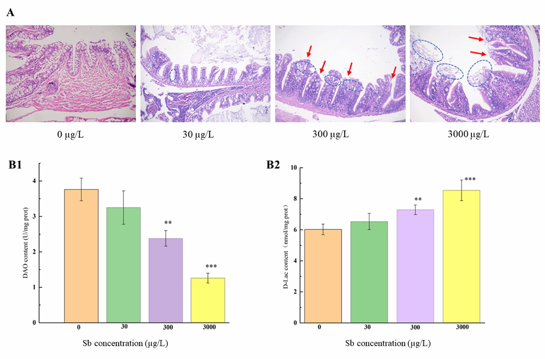 不同浓度锑暴露下斑马鱼各组织锑蓄积量及肠道组织损伤情况