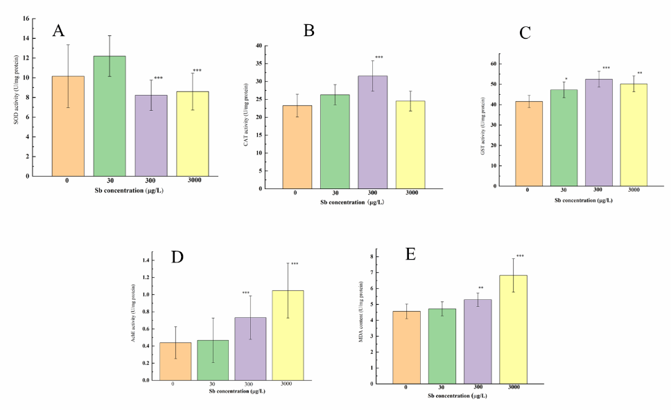 斑马鱼肠道组织在不同浓度慢性暴露锑下氧化应激指标变化