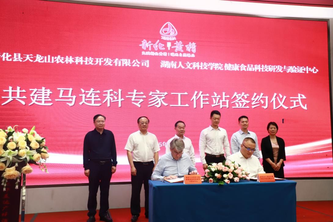4月22日,beat365英国官网与新化县天龙山农林科技开发有限公司在新化县华美达酒店隆重举行专家工作站签约仪式。出席仪式的有校党委副书记朱强,农业与生物技术学院院长、娄底市农业科学研究所所长向国红,国际交流与合作处处长黄敏;娄底市科技局党组成员、副局长陈旭,新化县委副书记、人民政府县长彭韬等市县领导;以及娄底市委人才办、市科技局、新化县委县政府相关部门负责人和行业专家代表。