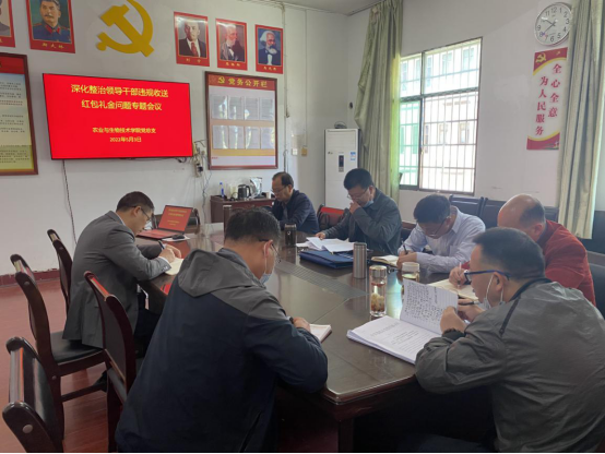 为贯彻落实习近平总书记关于全面从严治党重要论述和十九届中央纪委六次全会精神、赵乐际同志在湘调研讲话精神,坚持问题导向、目标导向,以钉钉子的精神坚决打好深化整治领导干部违规收送红包礼金攻坚战,持之以恒加固党中央八项规定堤坝,锲而不舍的纠“四风”、树新风,以更大力度防治风腐一体问题,着力营造农生院(农科所)风清气正的政治环境。于5月3日下午三点,农业与生物技术学院党总支在强毅楼305室召开了关于“深化整治领导干部违规收送红包礼金问题”专题会议。会议由农生院党总支书记胡少平主持,党总支委员及班子成员参与此次会议。