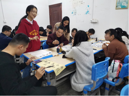 为了提升我院生物技术专业学生的师范技能,了解关于书法的基本知识,培养学生基本书法素质,4月3日,特邀请娄底书画协会龙育才老师来我院做指导。首先,龙老师通过自己的一幅书画作品向大家展示了汉字的演变过程,并告诉同学们初学者应从楷书开始练习。接着他以“永”字为例,一笔一划地教同学们如何落笔和运笔,并要求每位同学自己在纸上练习。自由练习的过程中龙老师走到每位学生身边,亲切和蔼地为同学们指点和示范,并和同学们分享自己的书法经验和故事,使大家产生了浓厚的学习书法的兴趣。通过这次的学习,同学们对书法有了更深的了解,掌握了基本的书法技巧,端正了学习态度,以身作则,重视“写好字”这一教师基本功,为成为一名合格的老师做准备。