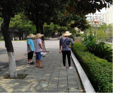 顶着炎炎烈日,向国红一行对全校各个区域的绿化区进行了实地察看,包括学生宿舍、教学楼、运动场、图书馆、办公楼及校园内主要道路等区域,并提出了相应的整改方案。