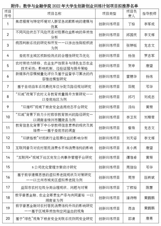 为推动和完善专业化的人才培养机制,提升本科生的科研创新水平,提高人才培养质量,根据学校《关于申报2022年度大学生创新创业训练计划项目的通知》要求,学院组织学生申报了2022年度大学生创新创业训练计划项目。经学院组织教学指导分委员会专家评审,拟推荐丁格等20名同学的项目参与学校2022年度大学生创新创业训练计划项目评选,现予以公示,具体名单见附件。